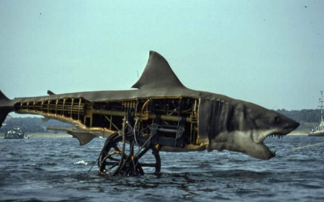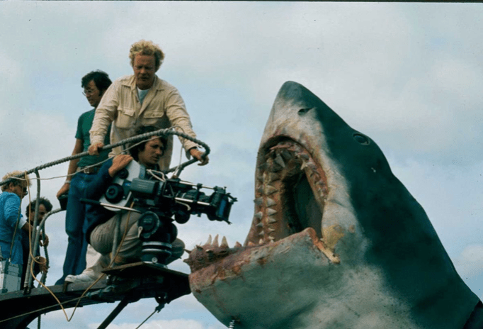 Una de las primeras películas del hoy ultra conocido Steven Spielberg, pero en los 70s era un joven director muy prometedor, que no llegaba ni a los 30 años, y fue “Tiburón” de 1975 la que le llevo a lo más alto. Pero curiosamente, rodando este thriller estuvo apunto dejar su carrera cinematográfica antes de empezarla. Spielberg quiso rodar el film no en una piscina y falsear las escenas como si fuera mar, sino en una playa de verdad en concreto en Martha`s Vineyard. Las consecuencias fue lo que convirtió dicho rodaje en una pesadilla. El tiburón, en un principio, fue diseñado desde el guión como un personaje que tenia muchísima mas presencia y tiempo en pantalla que en el resultado final, pero esto se tuvo que modificar porque no bastaba con gastarse un autentico dineral en tener 3 modelos de la bestia marina para diferentes usos, ángulos y planos, de hecho el modelo principal del tiburón mecánico, inesperadamente, ni siquiera se hundía en el agua, sumado al mal tiempo y al agua salada no hacían más que romperse, esto supuso retrasos en el rodaje (esta claro que fue un impedimento que se acabo convirtiendo en una de las claves del éxito del film) por estos retrasos y perdida de dinero supuso que Spielberg estuviese apunto de ser despedido, por si no fuera poco, hubo un accidente rodando una de las escenas con el bote en el agua, la cámara se hundió y varios técnicos tuvieron que viajar de emergencia para poder salvar el material grabado, sin olvidarnos que dos de los protagonistas Richard Dreyfuss y Robert Shaw tenían una pésima relación, apenas se aguantaban durante el rodaje, de hecho esa tensión se puede apreciar en el film y su joven director le saco todo el partido que pudo, al final gracias al talento del joven director de saber aprovechar los impedimentos y la maestría de John Williams por crear la banda sonora llena de suspense y tan memorable, junto con mas factores hizo que la película se convirtiera en un rotundo éxito.