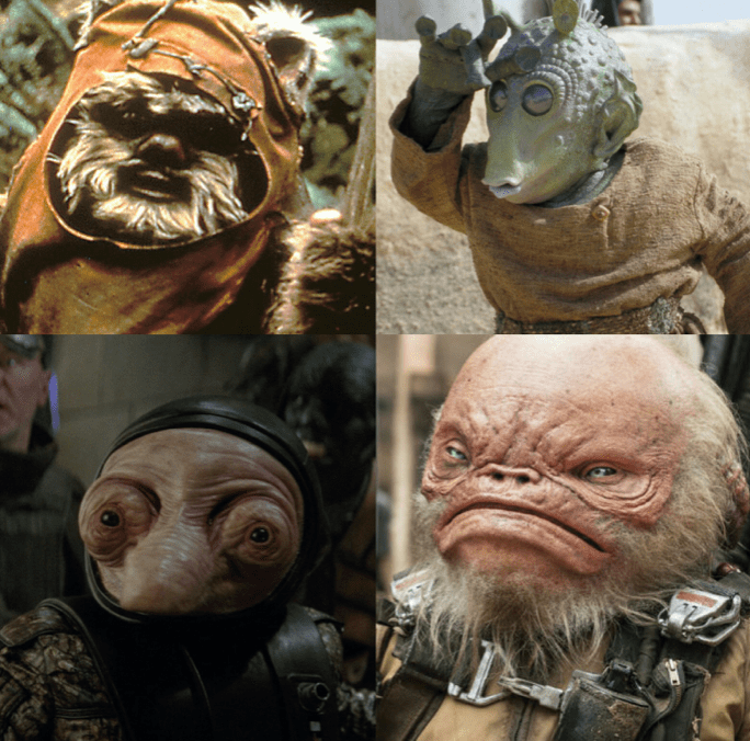 En numerosas películas tanto actuales como clásicas que tienen como personajes criaturas o monstruos humanoides suelen estar interpretadas por un actor, si es cierto que los efectos especiales han cambiado muchas cosas, con tener un poco de dinero, un traje de captura de movimiento y el teléfono de Andy Serkins tienes medio camino hecho. Aun así, en la actualidad, se continua utilizando técnicas de antaño algo mas evolucionadas o combinando tecnología y técnicas artesanas, ya que sigue habiendo actores especializados en estar escondidos en asombrosas caracterizaciones, lo que si esta claro que son nombres y caras que no sonaran, pero son los verdaderos rostros de los personajes.