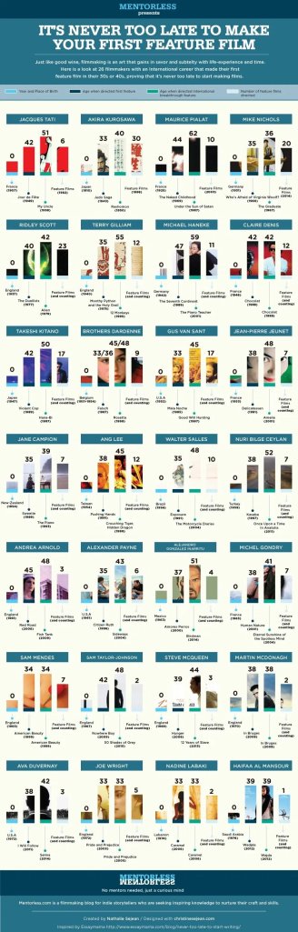 La web Mentorless ha elaborado una infografía de varios nombres importantes del séptimo arte que empezaron a dirigir bien pasada la treintena, donde al final por constancia, suerte o dedicación, deja un mensaje claro “nunca es tarde para dirigir la primera película”