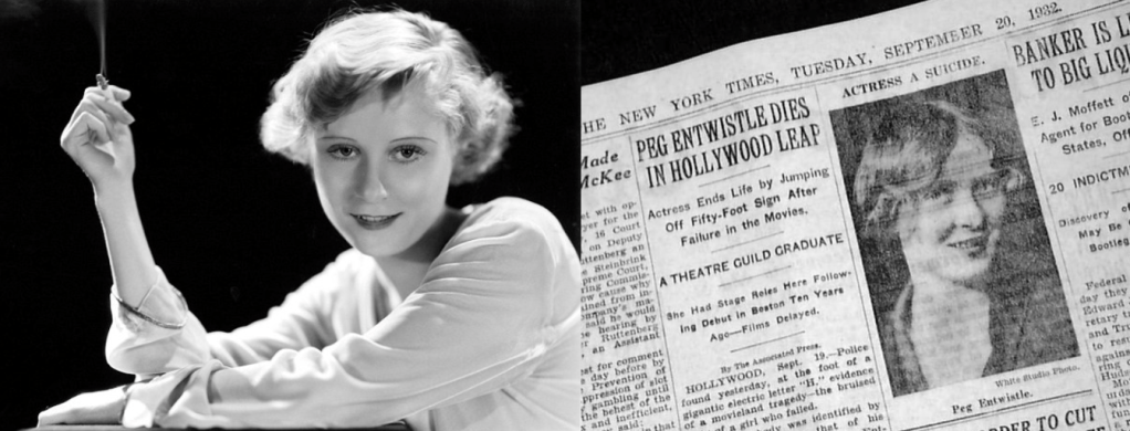 El 16 de Septiembre de 1932, Peg Entwistle avisó a sus tíos que iba a la farmacia, pero , en cambio se dirigió hasta el letrero de Hollywood, que copaba sus sueños adolescentes y que en aquella época el famoso letrero blanco decía “Hollywoodland”, subió 13 metros de escalera de mantenimiento y saltó desde lo alto de la letra “H”. Tenía 24 años y fue apodada como “La Chica del Letrero de Hollywood”