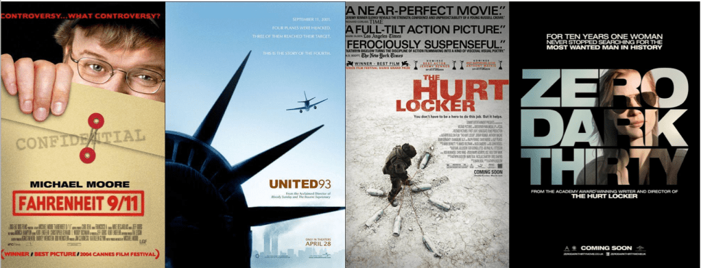 Entrado el nuevo siglo, en lo político y social, EEUU (y el mundo entero) se vio ya de primeras conmocionada por los atentados del 11S del 2001. Y el cine no tardo en recordar el dolor del atentado en las Torres Gemelas, la primera fue “Fahrenheit 9/11” de Michael Moore, un documental donde este arremete contra el presidente de entonces George Bush, por la decisión de entrar en una guerra contra Irak y aprovecharse del atentado, en 2006 ya en clave de ficción se estreno “Word Trade Center” de Oliver Stone, que narra los hechos desde diferentes puntos de vista, aunque otros como Paul Greengrass también relataron lo sucedido en la gran pantalla, con “United 93”, con esta película el cineasta se convirtió en un director a tener en cuenta, un autor a destacar en los últimos años, con un estilo muy particular de cámara en mano, pegarse a la acción y retratar sucesos reales de una forma muy cercana y cruda, a colaborado con Matt Damon en varias ocasiones como en la saga de Jason Bourne, o con Tom Hanks, mas cineastas como Kathryn Bigelow, (que empezó su carrera en los 90s) fue en el nuevo siglo cuando arraso en los Oscars con “En Tierra Hostil” (2008) donde se consagro y tomo referencias claras del terrorismo islámico, que recupero en otros films véase una de sus ultimas películas “La Noche más Oscura” (2012). Al igual que los 60s y los 70s fueron unos años influidos por la Guerra de Vietnam y el Watergate. El cine de principios de siglo estaba marcada por la Guerra de Irak y el espionaje contra organizaciones terroristas.