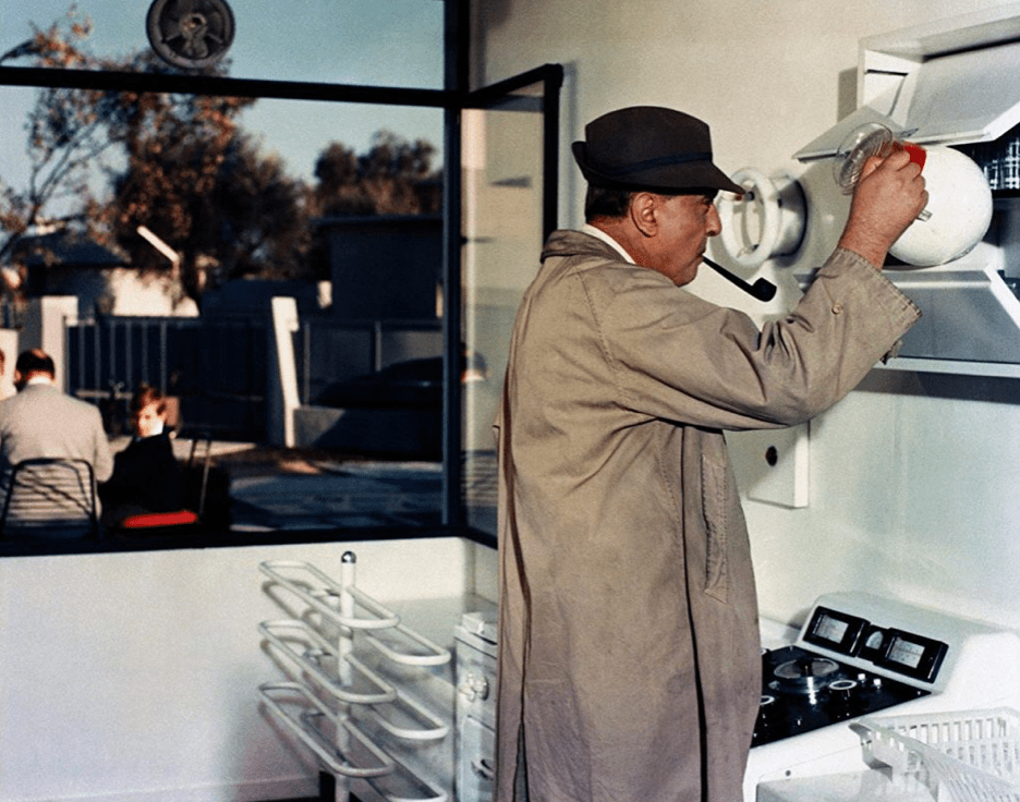 Si hay un genio absoluto que dejo mella en la comedia o más concretamente en la comedia física o slapstick ese fue sin lugar a dudas Charles Chaplin, evidentemente un genio absoluto del cine y del arte en general. Son muchos los herederos que ha tenido el propio Chaplin a lo largo de los años, pero si hay que destacar uno ese es el ya mencionado cineasta francés Jacques Tati. Y eso nos lleva a la película con la que cerramos la semana, “Mi tío” de 1958, película francesa, y la mas galardonada del cineasta franco, dado que se llevo el Oscar a mejor película de habla no inglesa y el premio del Jurado en el Fest de Cannes en su año de estreno. El propio Jacques Tati, dirige, escribe y protagoniza tanto esta como el resto de sus películas, donde suele interpretar a su alter-ego o personaje estrella más emblemático, hablamos del Sr. Hulot, algo parecido a Chaplin con su Charlot o Rowan Atkinson y su Mr. Bean. Realmente el argumento es lo de menos, ya sea en este film como en cualquier otro del cineasta, al final el núcleo de la trama es ver al carismático personaje central con su característico sombrero y su pipa en la boca haciendo de las suyas, un personaje bastante despistado, inadaptado, pero noble y extremadamente educado, que se ve enredado en situaciones locas. En “Mi Tio”, vemos la arquetípica confrontación que suele tener dicho personaje con el mundo moderno o los tiempos contemporáneos a modo de sátira e ironía, donde se mezcla el costumbrismo y la tradición de la vida rural, digamos que lo campechano con el futuro y la modernidad de un mundo retro futurista casi deshumanizado.