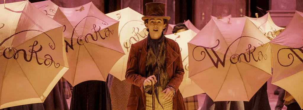 “Wonka” (2023), esta dirigida y escrita por el británico Paul King, el realizador de las dos películas de “Paddington” (2014 y 2017), y protagonizada por Timothee Chalamet como el famoso chocolatero, realmente esta bastante bien, se carga la película a sus hombros y de una forma bastante desvergonzada y con bastante soltura…baila, canta, mantiene una gran ilusión interpretativa durante todo el metraje y por lo tanto, solventa con creces un personaje construido con mucha destreza y que ademas se le da ciertos aires al Wonka clásico de Gene Wilder. Junto a Chalamet, tenemos a una debutante y joven Calah Lane, un cast repleto de rostros británicos bastante conocidos como la gran y oscarizada Olivia Colman como una antagonista bastante irreconocible y divertida, Hugh Grant poniendo rostro al Oompa-Loompa, un extraordinario Jim Carter (deleite interpretativo para los fans de “Downton Abbey”) y alguno de los rostros mas reconocidos de la comedia británica de los últimos 20 años…como Matt Lucas de “Little Britain”, Rowan Atkinson AKA Mr. Bean o el americano Keegan – Michael Key de “Key and Peele”. Si habéis visto las dos películas de “Paddington” en seguida entenderéis el tono de este “Wonka”, el tono de inteligente comedia británica super blanca y reconfortante, con un constante aire familiar e incluso en este caso navideño, las llamadas feel good movie, una “Mary Poppins” de ahora. Canciones que están compuestas por Neil Hannon del gran grupo indie pop The Divine Comedy, y forman parte de esa banda sonora algo más destacada que sus canciones, con aires bastante mágicos y emotivos en manos del compositor Toby Talbot. La cinta mezcla con bastante gracia: comedia, aventuras, drama, musical…donde todo empaca bastante bien, eso si, como ya hemos adelantado, hay canciones, por lo tanto, avisamos que es un musical, no al uso, puesto que hay pequeños momentos musicales muy puntuales, con canciones presentadas bajo secuencias muy vistosas, las cuales, eso si, no sustentan un gran interés, por eso, diriamos que el ambiente musical que crearon tanto Tim Burton como su compositor Danny Elfman en su versión del clásico literario mencionado del 2005 (sin ser un musical) es mucho mejor. Momentos musciales que a pesar del núlo interés de sus canciones, tampoco aborrecen, ni pausan ni entorpecen la historia, y por lo tanto fluyen y acompañan bien a lo largo del metraje. Curiosamente, hay dos canciones que diriamos que son una re-interpretacion directa de la película original de 1971.